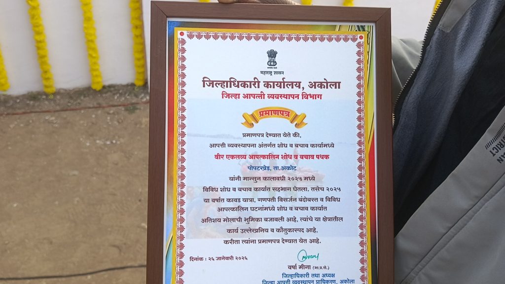 अकोला जिल्हाधिकारी कार्यालयाच्या आपत्ती व्यवस्थापन विभागाकडून वीर एकलव्य आपत्कालिन शोध व बचाव पथक, पोपटखेड (ता. अकोट) यांना उल्लेखनीय कार्यासाठी सन्मानित करण्यात आले आहे. मान्सून कालावधी २०२५ दरम्यान विविध शोध व बचाव मोहिमा, आपत्कालीन परिस्थितीतील मदतकार्य तसेच कावड यात्रा, गणपती विसर्जन बंदोबस्त आणि इतर सार्वजनिक कार्यक्रमांमध्ये या पथकाने अतिशय महत्त्वाची भूमिका बजावली होती.