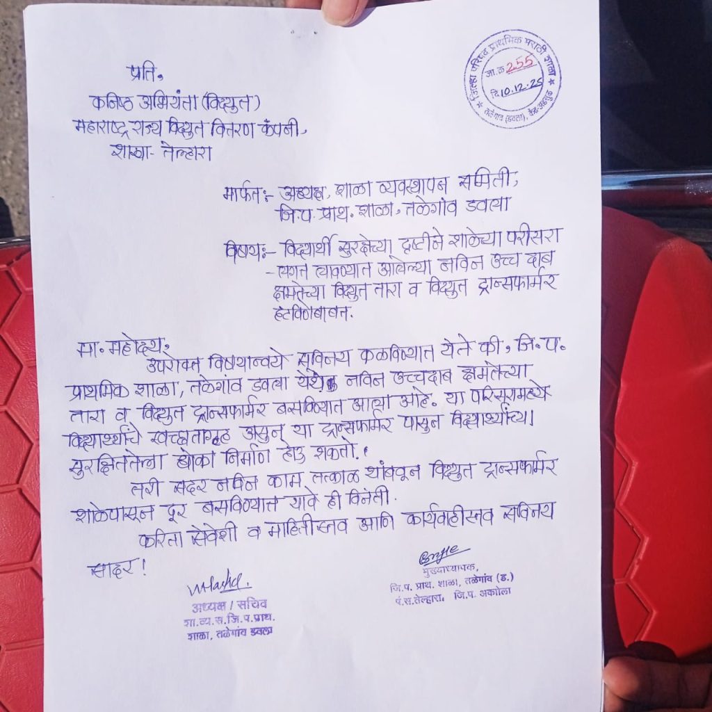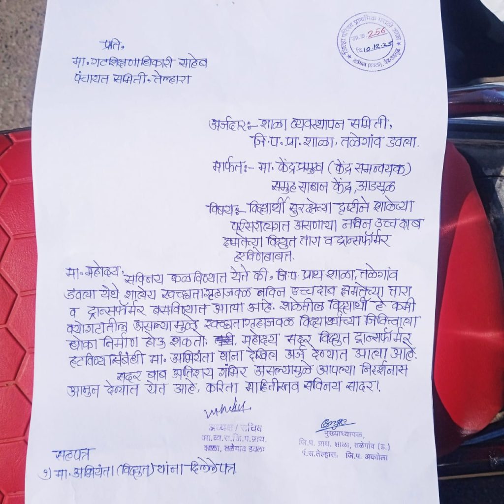 या संदर्भात महावितरणच्या संबंधित अभियंत्यांनाही लेखी अर्ज देण्यात आला असून, तरीही अद्याप ठोस कार्यवाही झालेली नाही. विद्यार्थ्यांचे भवितव्य आणि सुरक्षितता धोक्यात येत असल्याने ही बाब अतिशय गंभीर असल्याचे शाळा व्यवस्थापन समितीने स्पष्ट केले आहे.