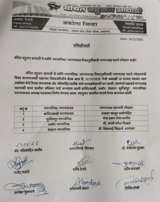 वंचित बहुजन आघाडीचा पहिला डाव! नगराध्यक्ष पदांसाठी उमेदवारांची जाहीर यादी – अकोल्यातील राजकारणात खळबळ
